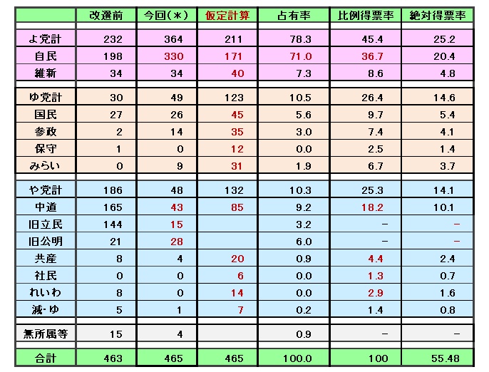 数表では併せて、比例代表の得票率で案分した議席数を「仮定計算」欄に記入した。