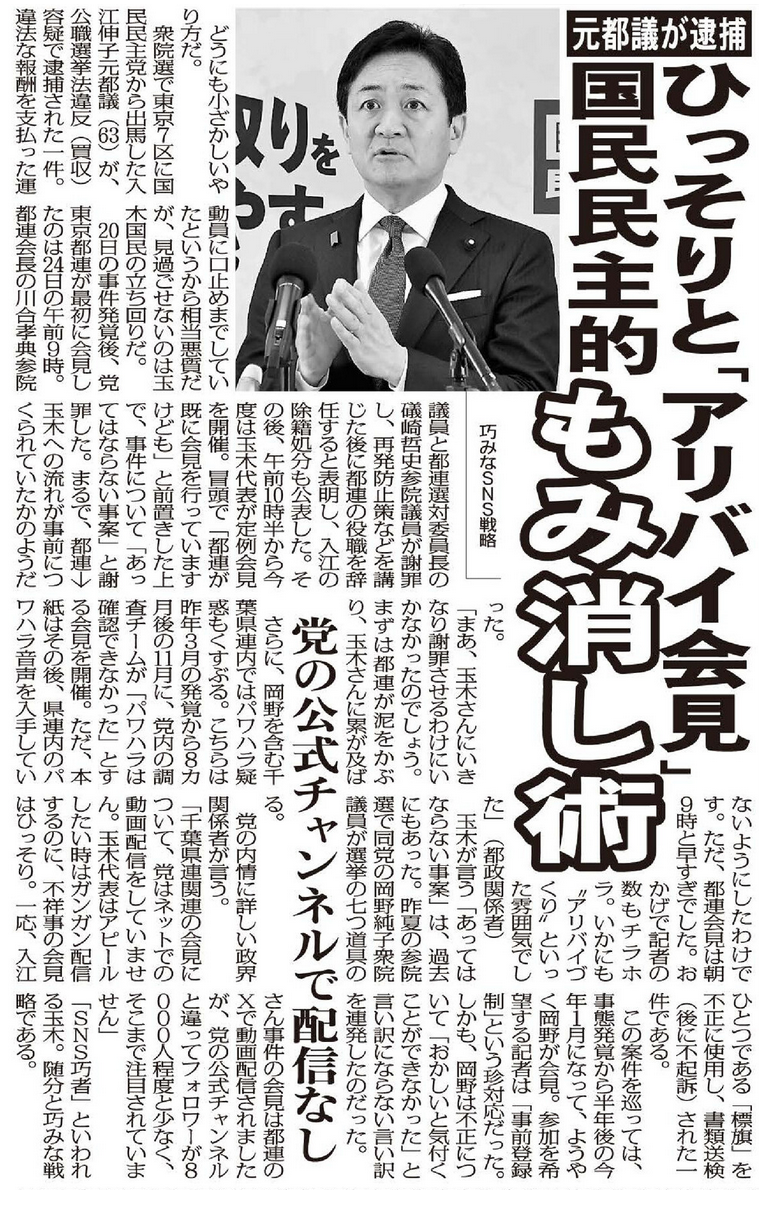 20日の事件発覚後、党東京都連が最初に会見したのは24日の午前9時。都連会長の川合孝典参院議員と都連選対委員長の礒崎哲史参院議員が謝罪し、再発防止策などを講じた後に都連の役職を辞任すると表明し、入江元都議の除籍処分も公表した。その後、午前10時半から今度は玉木代表が定例会見を開催。冒頭で「都連が既に会見を行っていますけども」と前置きした上で、事件について「あってはならない事案」と謝罪した。まるで、都連→玉木代表への流れが事前につくられていたかのようだった。