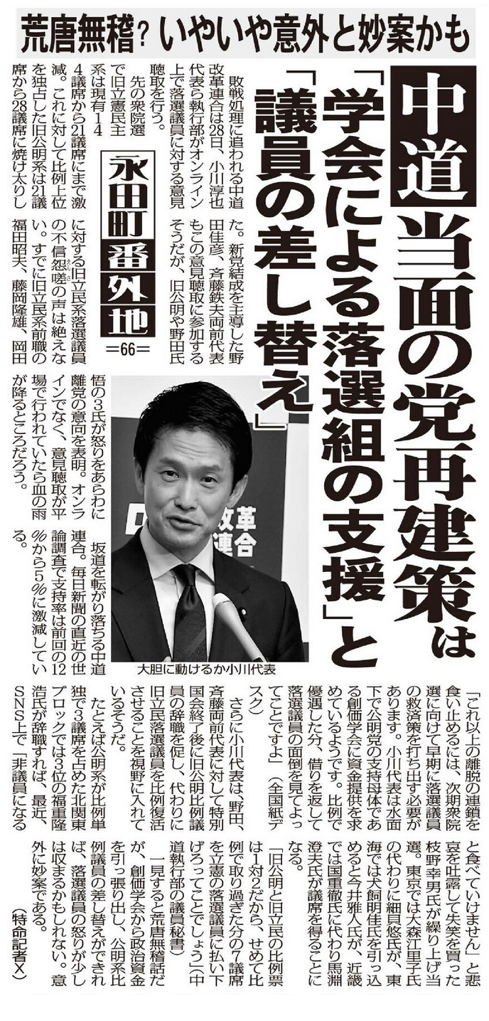 中道にとっての当面の党再建策は「学会による落選組の支援」と「議員の差し替え」