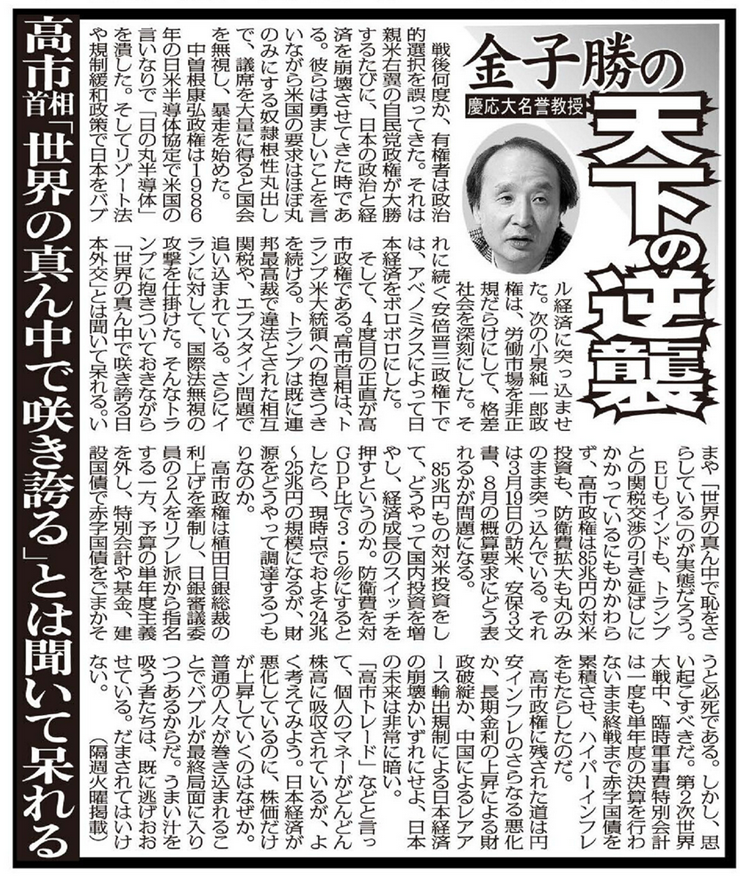 高市首相「世界の真ん中で咲き誇る」とは聞いて呆れる 金子勝の「天下の逆襲」