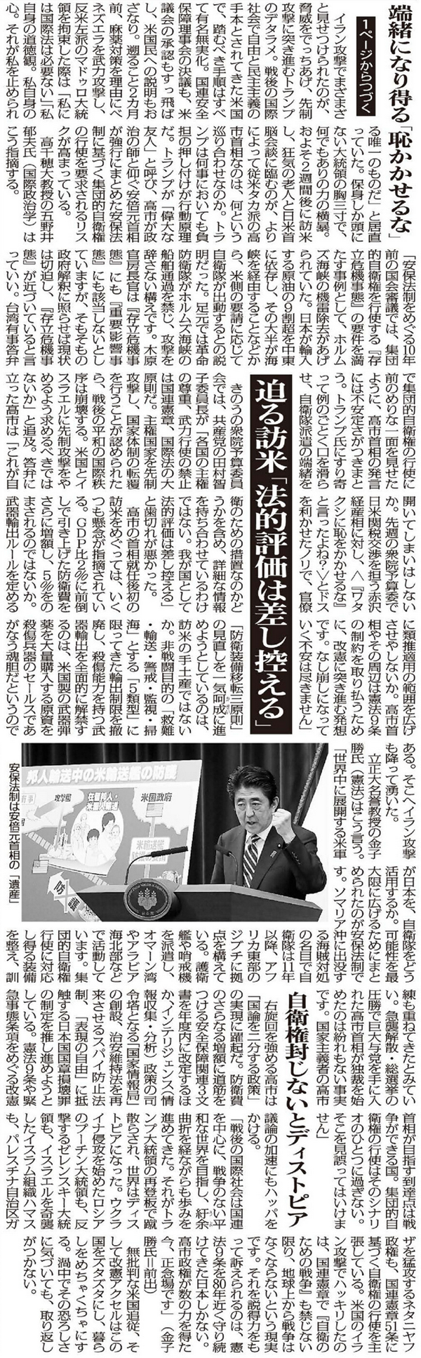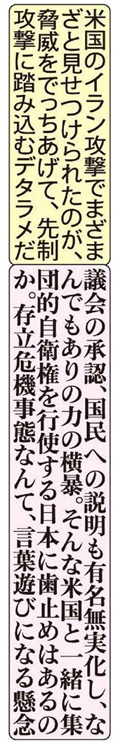 米国のイラン攻撃でまざまざと見せつけられたのが、脅威をでっちあげて、先制攻撃に踏み込むデタラメだ。議会の承認、国民への説明も有名無実化し、なんでもありの力の横暴。そんな米国と一緒に集団的自衛権を行使する日本に歯止めはあるのか。存立危機事態なんて、言葉遊びになる懸念。