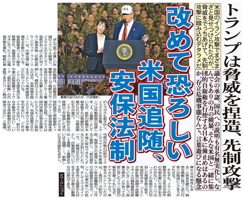 イラン攻撃でまざまざと見せつけられたのが、脅威をでっちあげ、先制攻撃に突き進むトランプのデタラメ。戦後の国際社会で自由と民主主義の手本とされてきた米国で、踏むべき手順はすべて有名無実化。国連安全保障理事会の決議も、米議会の承認もすっ飛ばし、米国民への説明もおざなり。遡ること2カ月前、麻薬対策を理由にベネズエラを武力攻撃し、反米左派のマドゥロ大統領を拘束した際は「私には国際法は必要ない」「私自身の道徳観。私自身の心。それが私を止められる唯一のものだ」と居直っていた。保身しか頭にない大統領の胸三寸で、何でもありの力の横暴。およそ2週間後に訪米し、狂気の老人と日米首脳会談に臨むのが、よりによって従米タカ派の高市首相なのは、何という巡り合わせなのか。トランプは何事においても負担の押し付けが行動原理だ。トランプが「偉大な友人」と呼び、高市が政治の師と仰ぐ安倍元首相が強行にまとめた安保法制に基づく集団的自衛権の行使を要求されるリスクが高まっている。