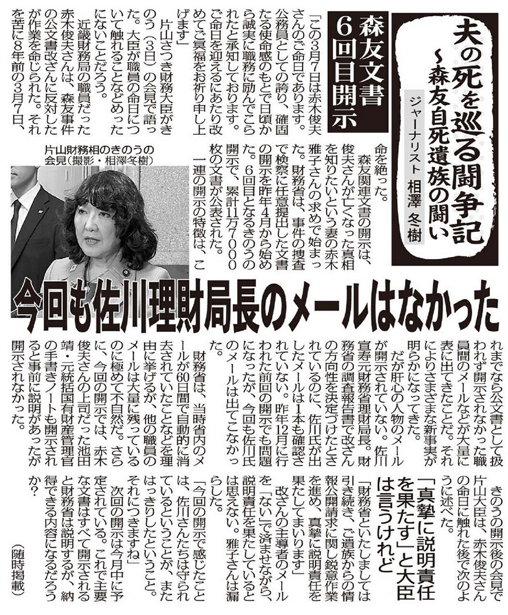 「森友文書」6回目開示 今回も佐川理財局長のメールはなかった 森友遺族・夫の死を巡る闘争記