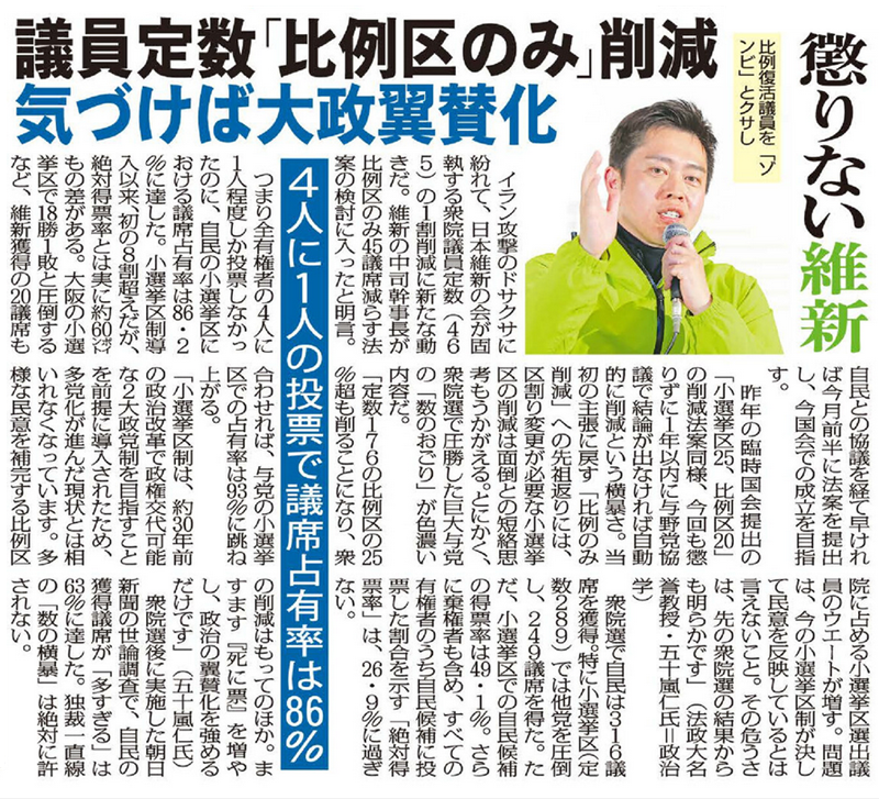 イラン攻撃のドサクサに紛れて、日本維新の会が固執する衆院議員定数(465)の1割削減に新たな動きだ。維新の中司幹事長が比例区のみ45議席減らす法案の検討に入ったと明言。自民との協議を経て早ければ今月前半に法案を提出し、今国会での成立を目指す。