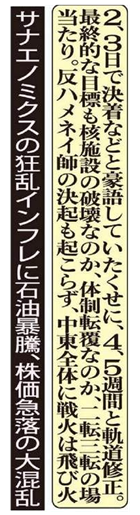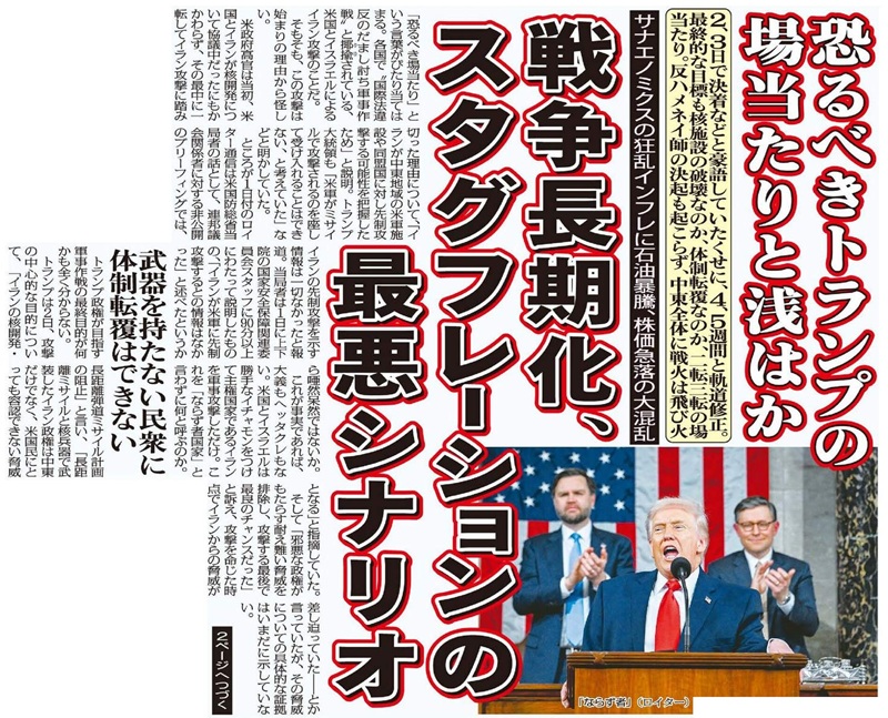 2、3日で決着などと豪語していたくせに、4、5週間と軌道修正。最終的な目標も核施設の破壊なのか、体制転覆なのか、二転三転の場当たり。反ハメネイ師の決起も起こらず、中東全体に戦火は飛び火。サナエノミクスの狂乱インフレに石油暴騰、株価急落の大混乱。