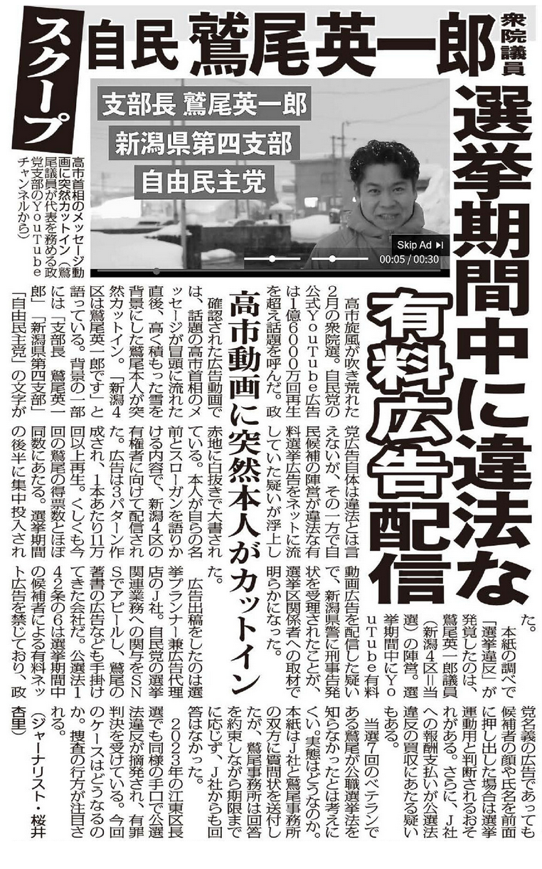 【スクープ!】自民・鷲尾英一郎陣営が衆院選期間中に違法な有料動画広告を配信! 新潟県警が刑事告発状を受理