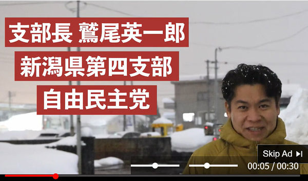 確認された広告動画では、話題の高市首相のメッセージが冒頭に流れた直後、高く積もった雪を背景にした鷲尾氏本人が突然カットイン。「新潟4区は鷲尾英一郎です」と語っている。背景の一部には「支部長 鷲尾英一郎」「新潟県第四支部」「自由民主党」の文字が赤地に白抜きで大書されている。本人が自らの名前とスローガンを語りかける内容で、新潟4区の有権者に向けて配信された。広告は3パターン作成され、1本あたり11万回以上再生。くしくも今回の鷲尾氏の得票数とほぼ同数にあたる。選挙期間の後半に集中投入された。