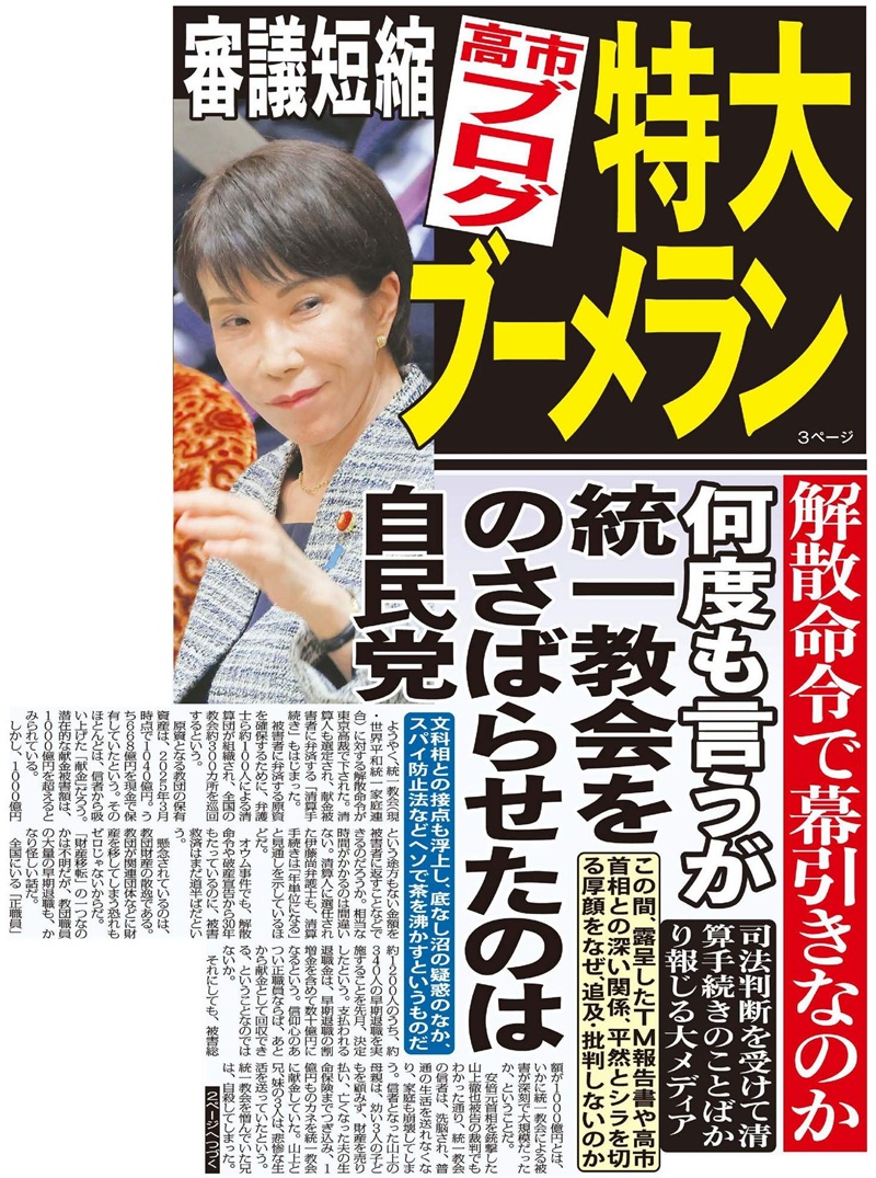 司法判断を受けて清算手続きのことばかり報じる大メディア。この間、露呈したTM報告書や高市首相との深い関係、平然とシラを切る厚顔をなぜ、追及・批判しないのか。