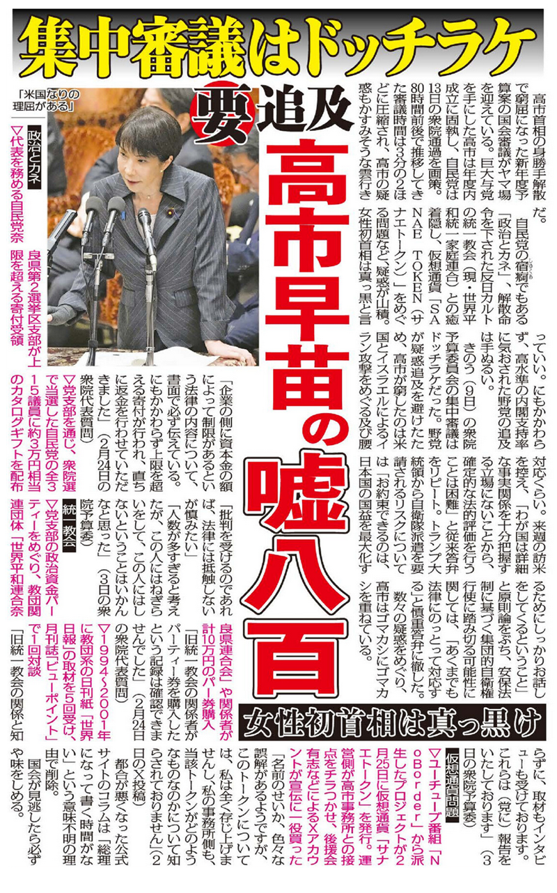 自民党の宿痾でもある「政治とカネ」、解散命令を下された反日カルトの統一教会(現・世界平和統一家庭連合)との癒着隠し、仮想通貨「SANAE TOKEN(サナエトークン)」をめぐる問題など、疑惑が山積。女性初首相は真っ黒と言っていい。にもかかわらず、高水準の内閣支持率に気おされた野党の追及は手ぬるい。