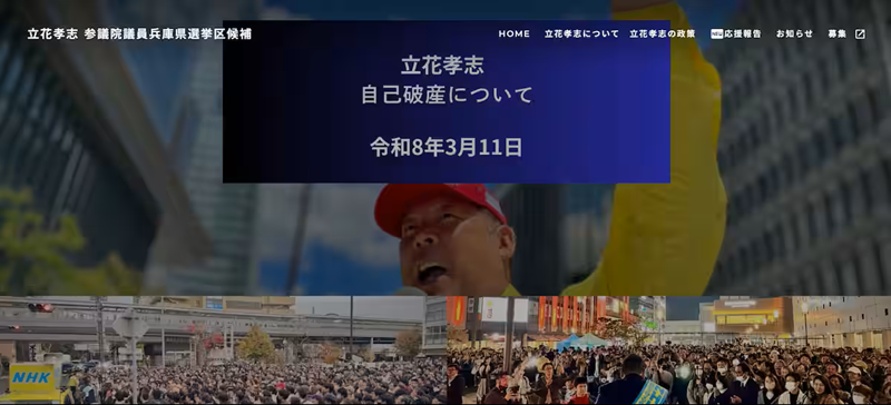 HPによると、立花氏は3月4日に自己破産を申し立て、東京地裁が同11日に手続き開始を決定した。個人の債権者は約240人で、届け出債権の総額は約12億4400万円。一方、個人資産は約1500万円前後とされ、確定申告に伴い同額以上の所得税を納める必要があるため「現時点で配当可能な財源がございません」と説明している。