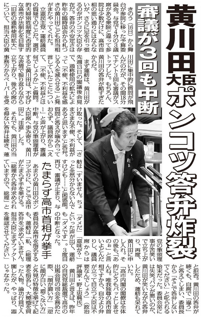黄川田氏と言えば、昨年の自民党総裁選で高市首相の出馬会見の司会を務めた際、「顔が濃い方」「逆に顔が白い、濃くない方」と外見の特徴を挙げて記者を指名し、大顰蹙を買った人物。論功行賞で入閣したが、やっぱり、器じゃなかった。