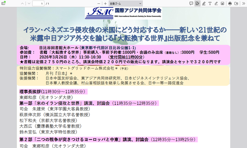 国際アジア共同体学会会長を務められているのは進藤榮一筑波大名誉教授。