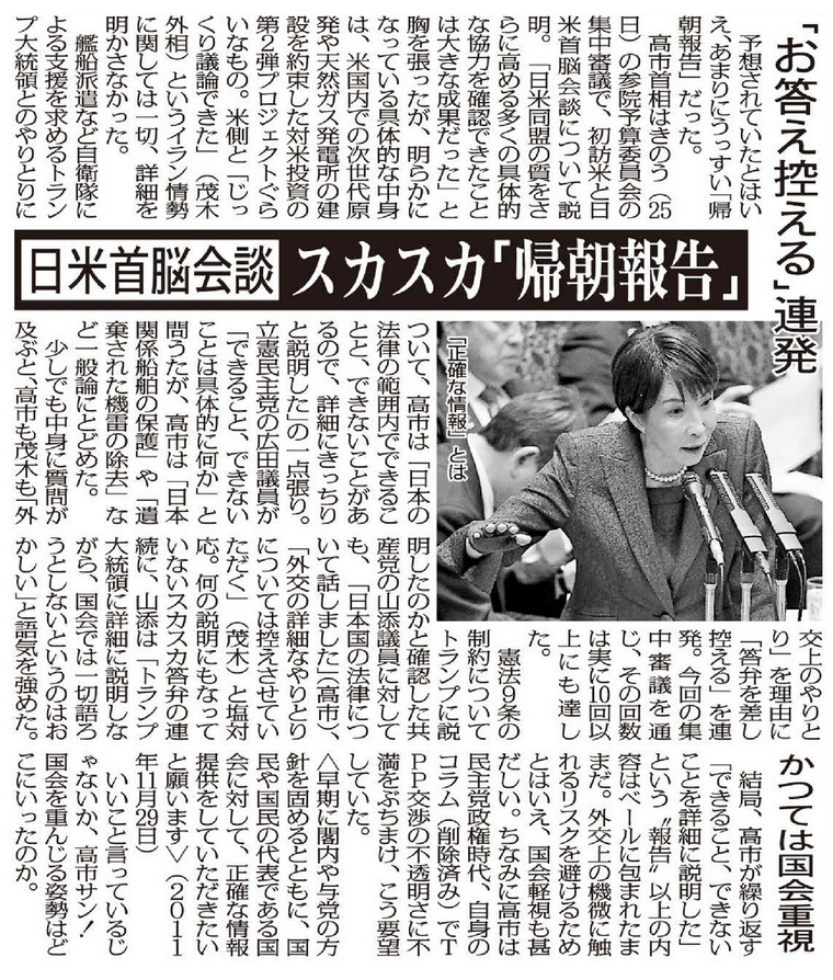 高市首相の日米首脳会談「帰朝報告」は中身スカスカ…イラン情勢の詳細は「お答え控える」連発の厚顔