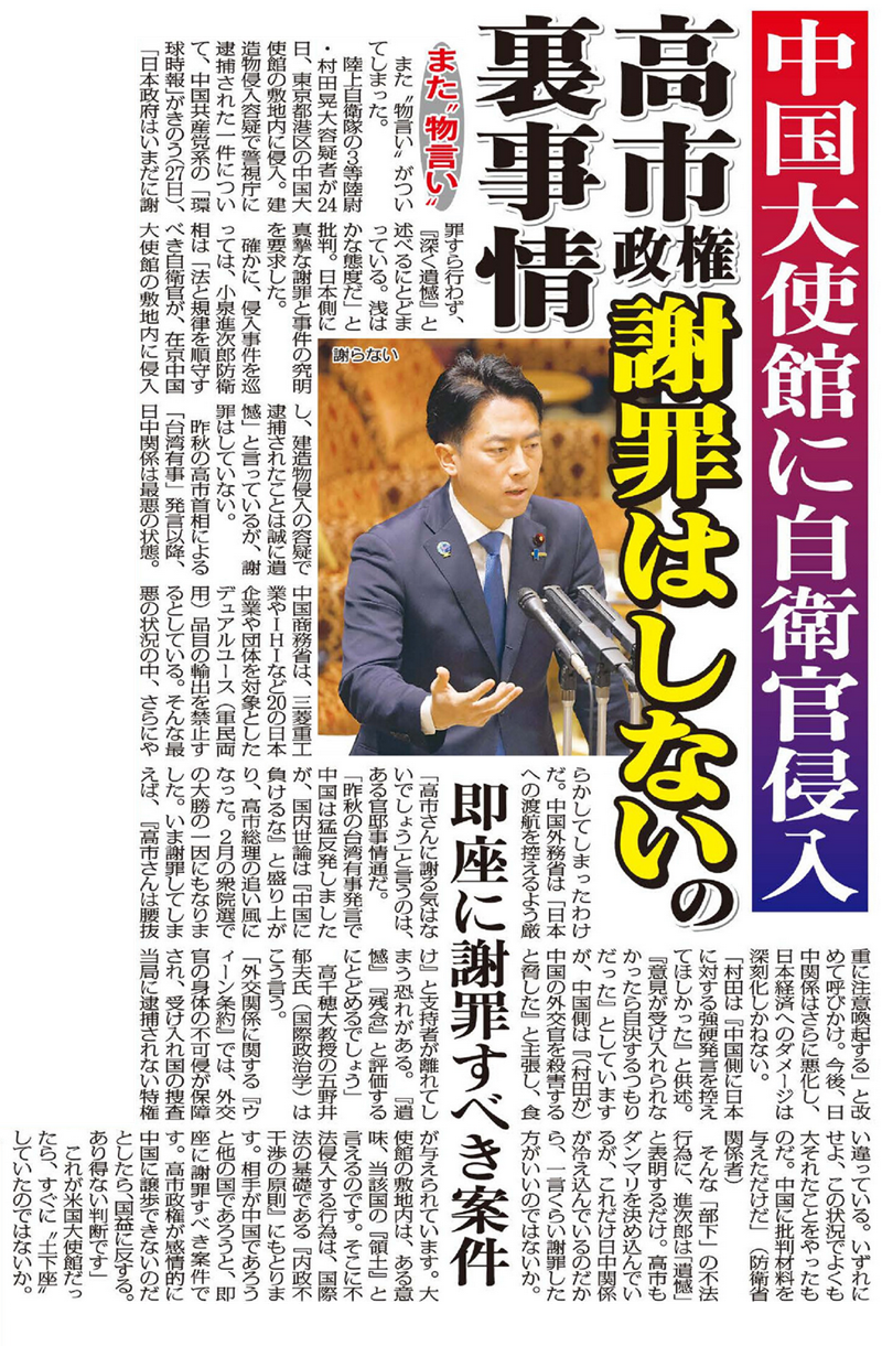 確かに、侵入事件を巡っては、小泉進次郎防衛相は「法と規律を順守すべき自衛官が、在京中国大使館の敷地内に侵入し、建造物侵入の容疑で逮捕されたことは誠に遺憾」と言っているが、謝罪はしていない。