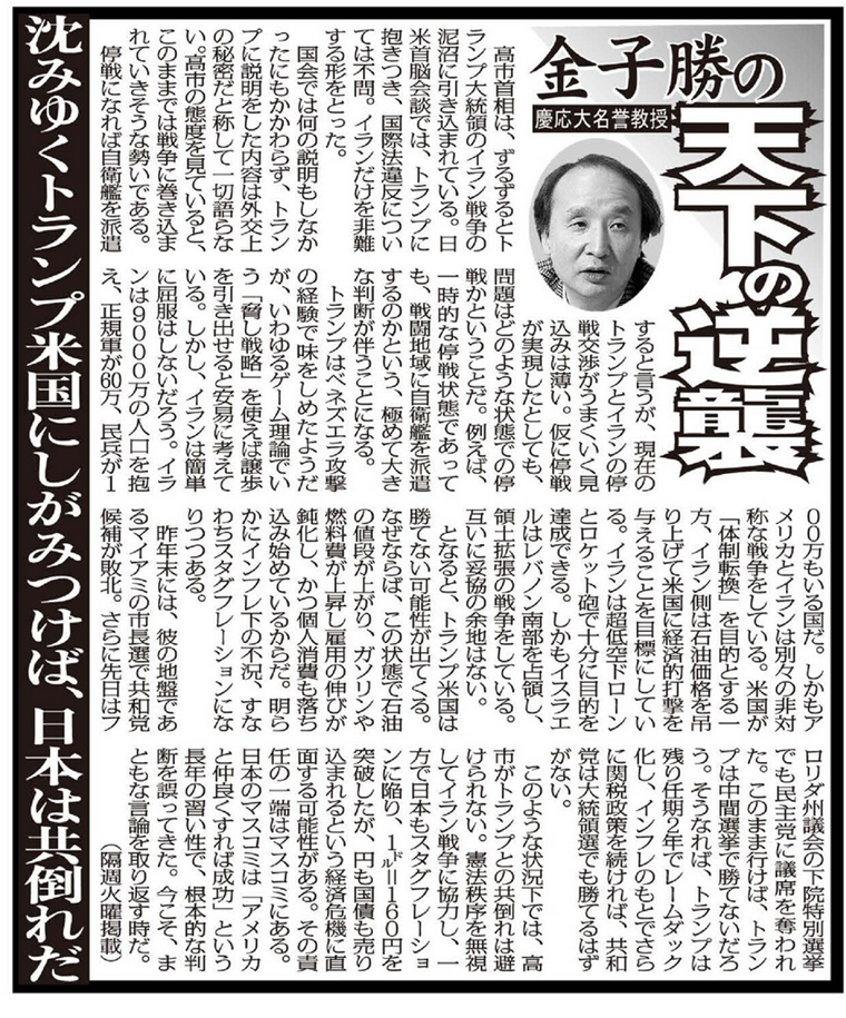 このような状況下では、高市がトランプとの共倒れは避けられない。憲法秩序を無視してイラン戦争に協力し、一方で日本もスタグフレーションに陥り、1ドル=160円を突破したが、円も国債も売り込まれるという経済危機に直面する可能性がある。その責任の一端はマスコミにある。日本のマスコミは「アメリカと仲良くすれば成功」という長年の習い性で、根本的な判断を誤ってきた。今こそ、まともな言論を取り返す時だ。