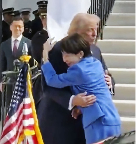 妄信が共倒れを招く…(いきなりトランプ米大統領に抱きつく高市首相=ホワイトハウスのXから)