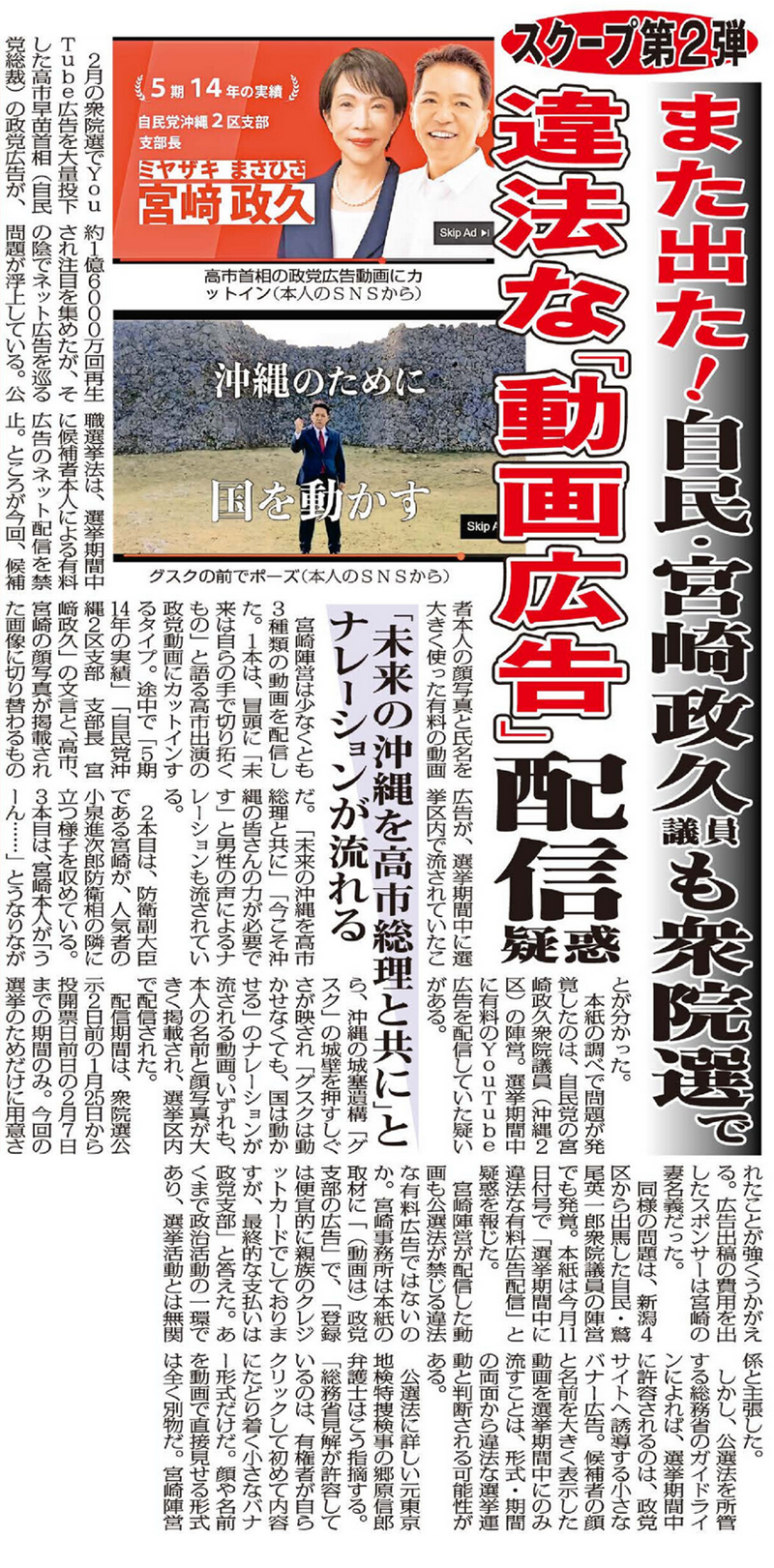 宮崎陣営は少なくとも3種類の動画を配信した。1本は、冒頭に「未来は自らの手で切り拓くもの」と語る高市出演の政党動画にカットインするタイプ。途中で「5期14年の実績」「自民党沖縄2区支部 支部長 宮ア政久」の文言と、高市、宮崎氏の顔写真が掲載された画像に切り替わるものだ。「未来の沖縄を高市総理と共に」「今こそ沖縄の皆さんの力が必要です」と男性の声によるナレーションも流されている。