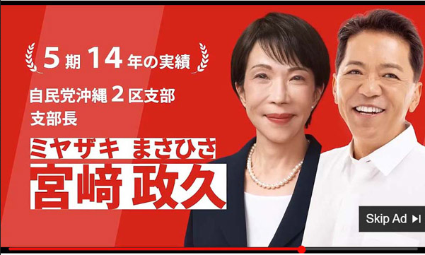日刊ゲンダイの調べで問題が発覚したのは、自民党の宮崎政久衆院議員(沖縄2区)の陣営。選挙期間中に有料のYouTube広告を配信していた疑いがある。