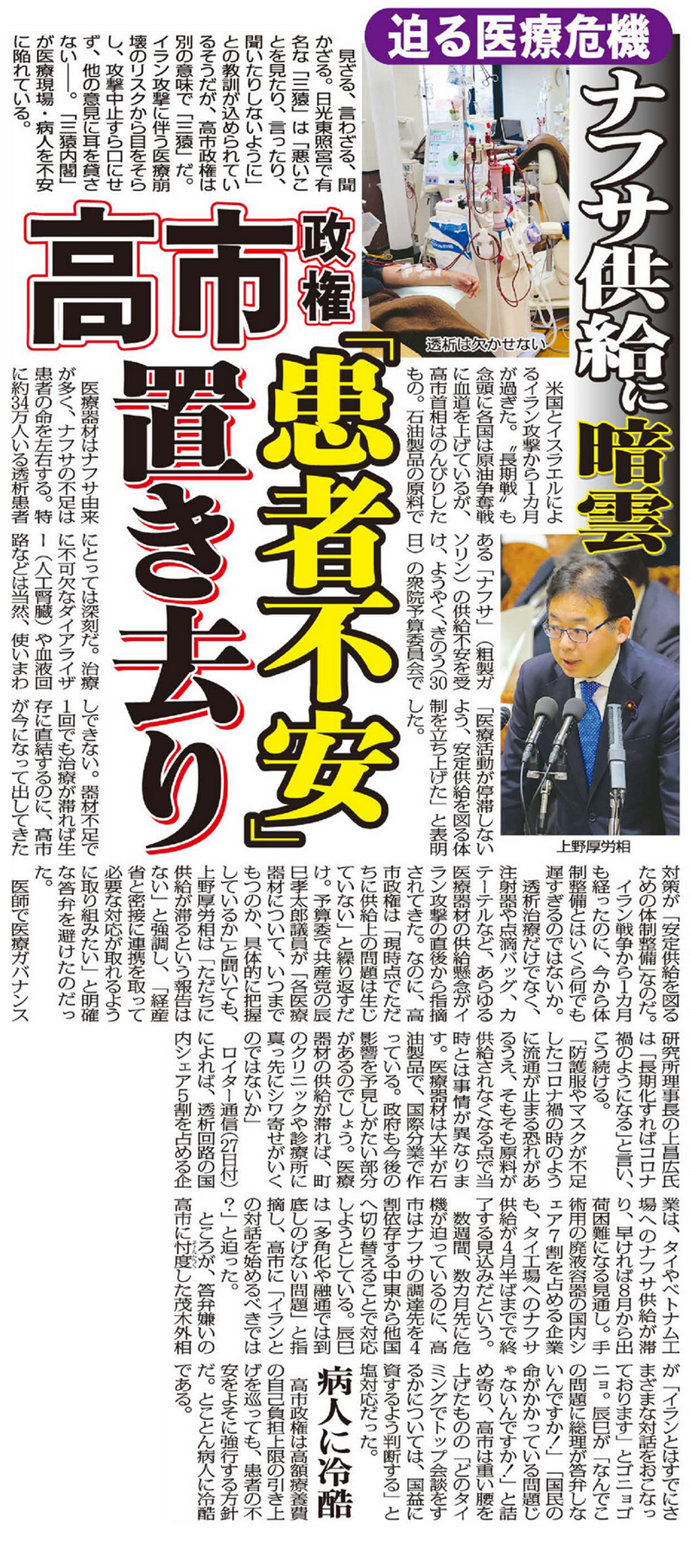 ロイター通信(27日配信)によれば、ナフサの供給不足がこのまま深刻化した場合、緊急性の高い医療機器が品目によっては4月半ばから8月ごろにかけて不足に陥る可能性があるという。中でも「人工透析」は深刻。物流ニュースサイトの「ロジスティクス・トゥデイ」(27日配信)によれば、治療に不可欠なダイアライザー(人工腎臓)と血液回路はすべて石油化学由来の樹脂でできているうえ、感染症予防の観点から使い捨てだ。国内の透析患者は約34万人。週3回の治療で消費されるダイアライザーは年間5000万本を超えるという。