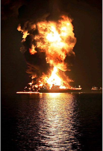 炎上するタンカー(C)AP=共同