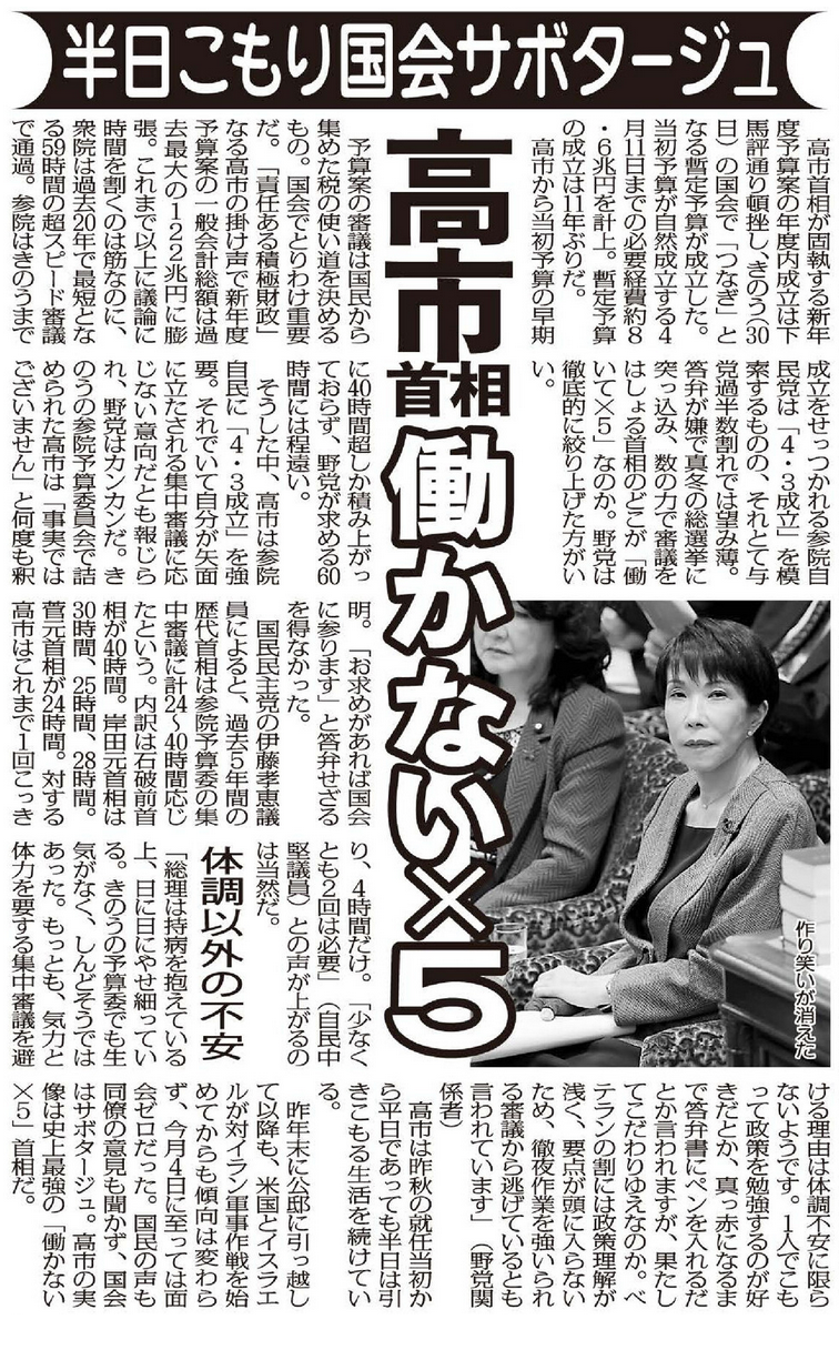 高市首相から当初予算の早期成立をせっつかれる参院自民党は「4.3成立」を模索するものの、それとて与党過半数割れでは望み薄。答弁が嫌で真冬の総選挙に突っ込み、数の力で審議をはしょる首相のどこが「働いて×5」なのか。野党は徹底的に絞り上げた方がいい。