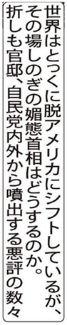 世界はとっくに脱アメリカにシフトしているが、その場しのぎの媚態首相はどうするのか。折しも官邸、自民党内外から噴出する悪評の数々。