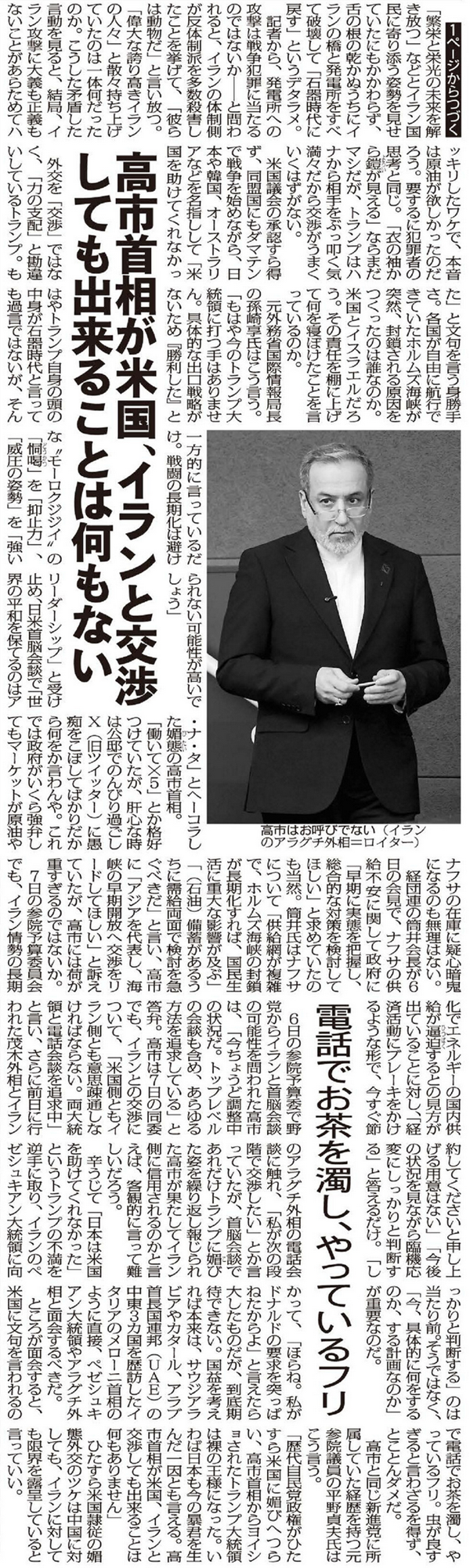 「歴代自民党政権がひたすら米国に媚びへつらい、高市首相からヨイショされたトランプ大統領は裸の王様になった。いわば日本も今の暴君を生んだ一因とも言える。高市首相が米国、イランと交渉しても出来ることは何もありません」