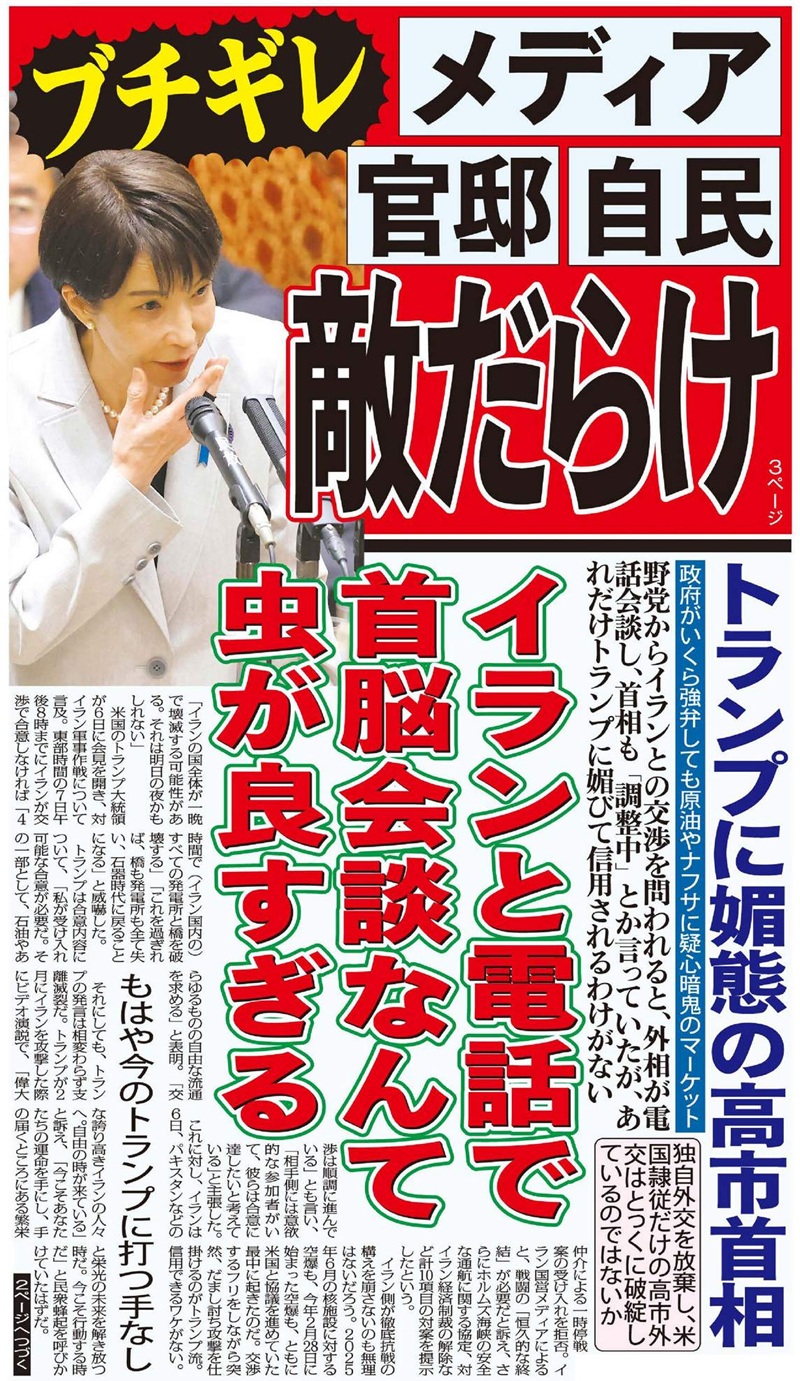 6日の参院予算委で野党からイランと首脳会談の可能性を問われた高市は、「今ちょうど調整中の状況だ。トップレベルの会談も含め、あらゆる方法を追求している」と答弁。高市は7日の同委でも、イランとの交渉について、「米国側ともイラン側とも意思疎通しなければならない。両大統領と電話会談を追求中」と言い、さらに前日に行われた茂木外相とイランのアラグチ外相の電話会談に触れ、「私が次の段階で交渉したい」とか言っていたが、首脳会談であれだけトランプに媚びた姿を繰り返し報じられた高市が果たしてイラン側に信用されるのかと言えば、客観的に言って難しいだろう。