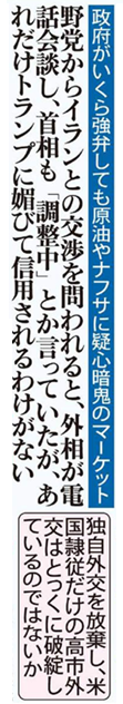 政府がいくら強弁しても原油やナフサに疑心暗鬼のマーケット。野党からイランとの交渉を問われると、外相が電話会談し、首相も「調整中」とか言っていたが、あれだけトランプに媚びて信用されるわけがない。