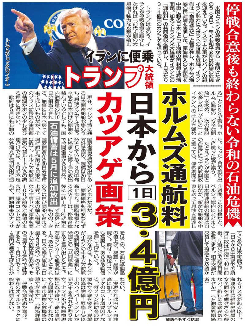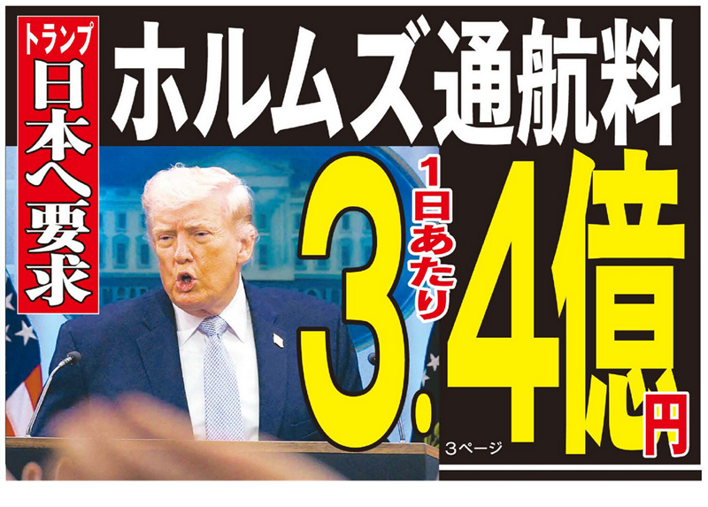 厄介なのは、トランプがイランのホルムズ海峡の通航料徴収に便乗し、米国との「共同事業」にすると言い出したこと。石油タンカーの通航料は1バレルあたり1ドルとされる。日本の輸入原油(日量236万バレル)のうちホルムズ依存度は93%。その日量219万バレルで計算すると、1日だけで3.4億円を巻き上げられかねない。