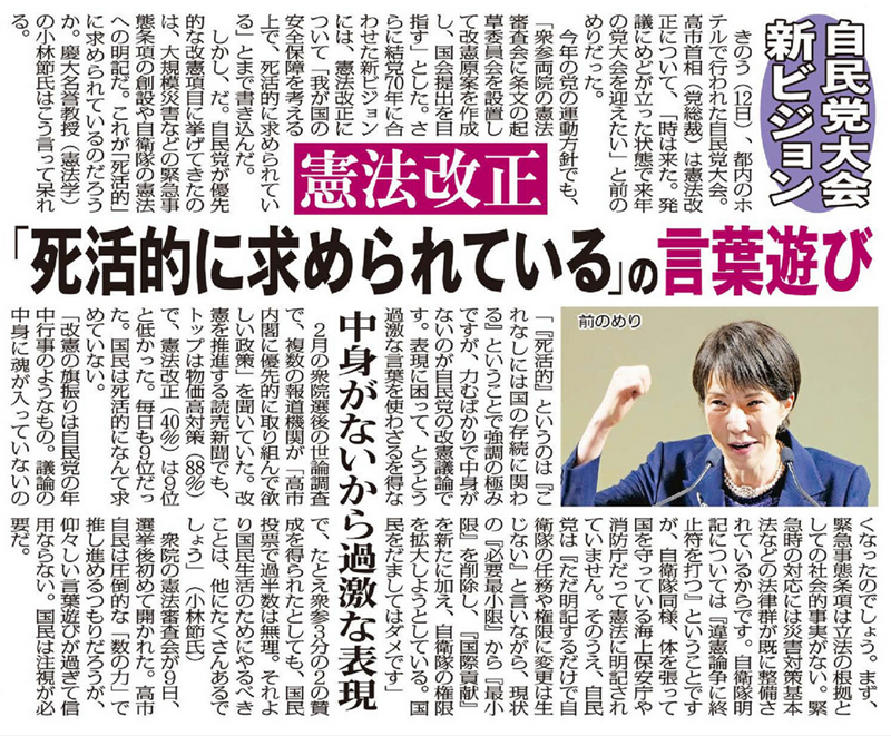 「『死活的』というのは『これなしには国の存続に関わる』ということで強調の極みですが、力むばかりで中身がないのが自民党の改憲議論です。表現に困って、とうとう過激な言葉を使わざるを得なくなったのでしょう。まず、緊急事態条項は立法の根拠としての社会的事実がない。緊急時の対応には災害対策基本法などの法律群が既に整備されているからです。自衛隊明記については『違憲論争に終止符を打つ』ということですが、自衛隊同様、体を張って国を守っている海上保安庁や消防庁だって憲法に明記されていません。そのうえ、自民党は『ただ明記するだけで自衛隊の任務や権限に変更は生じない』と言いながら、現状の『必要最小限』から『最小限』を削除し、『国際貢献』を新たに加え、自衛隊の権限を拡大しようとしている。国民をだましてはダメです」