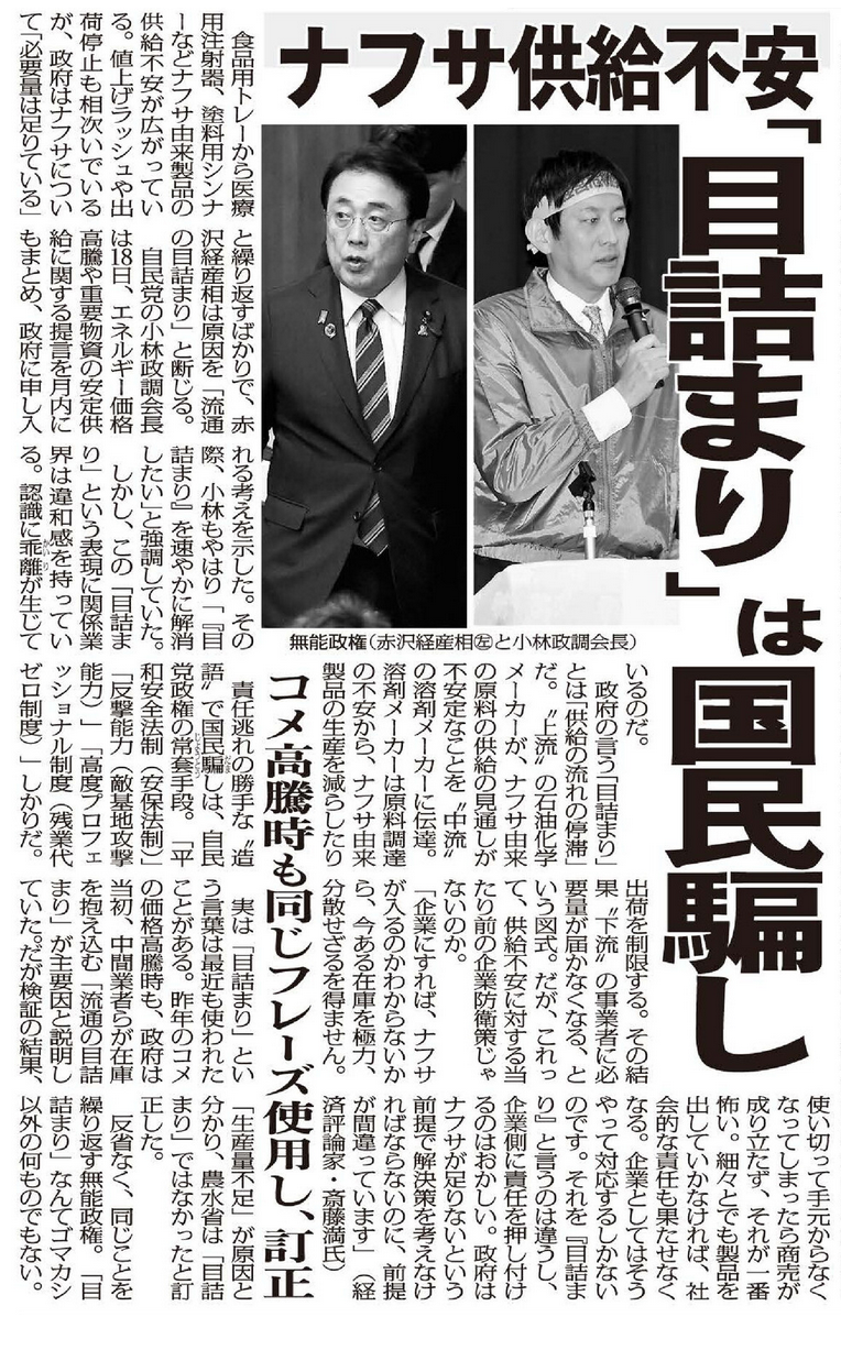 食品用トレーから医療用注射器、塗料用シンナーなどナフサ由来製品の供給不安が広がっている。値上げラッシュや出荷停止も相次いでいるが、政府はナフサについて「必要量は足りている」と繰り返すばかりで、赤沢経産相は原因を「流通の目詰まり」と断じる。