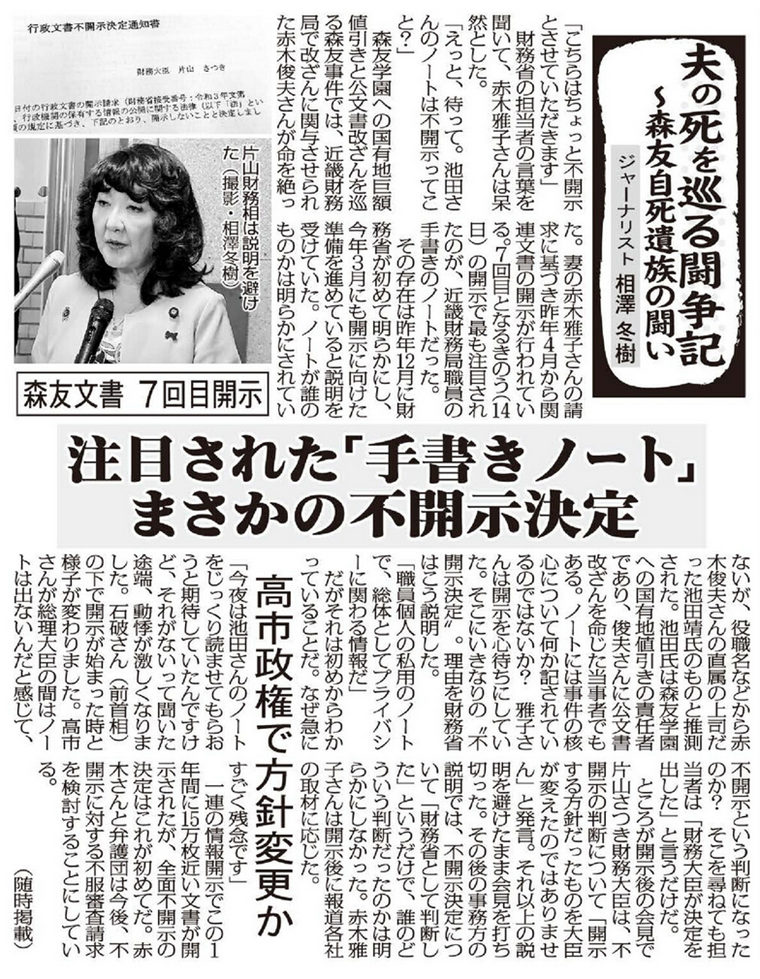 森友文書7回目開示も注目の「手書きノート」まさかの不開示決定…高市政権で方針変更か 森友遺族・夫の死を巡る闘争記