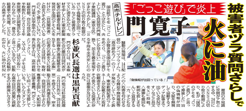 国会前デモを「ごっこ遊び」と小ばかにし、炎上している自民党の門寛子衆院議員(東京8区)がまたやらかした。「SNS上の切り取り動画のせいで偽情報が出回っている」などと被害者ヅラでXに書き込んだ上、取材を申し入れた東京新聞記者の依頼書を投稿。「門発言が全国のデモに火を付けた」(自民関係者)と眉をひそめられているのに、全く懲りていない。