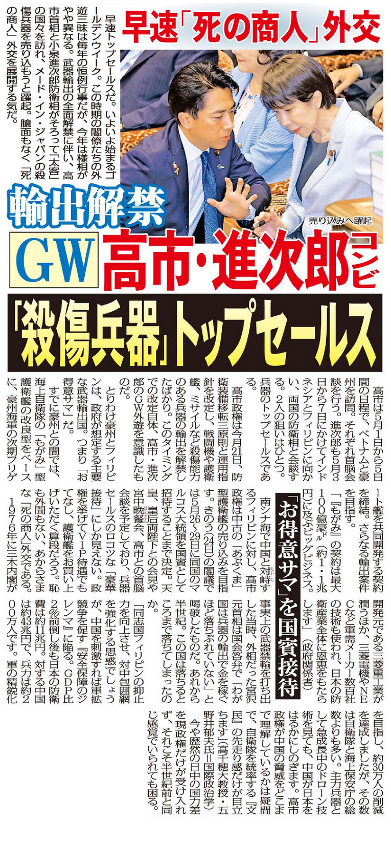 高市政権は今月21日、防衛装備移転三原則と運用指針を改定し、戦闘機や護衛艦、ミサイルなど殺傷能力のある兵器の輸出を解禁したばかり。このタイミングでの改定自体、高市・進次郎のGW外遊を意識したものだ。