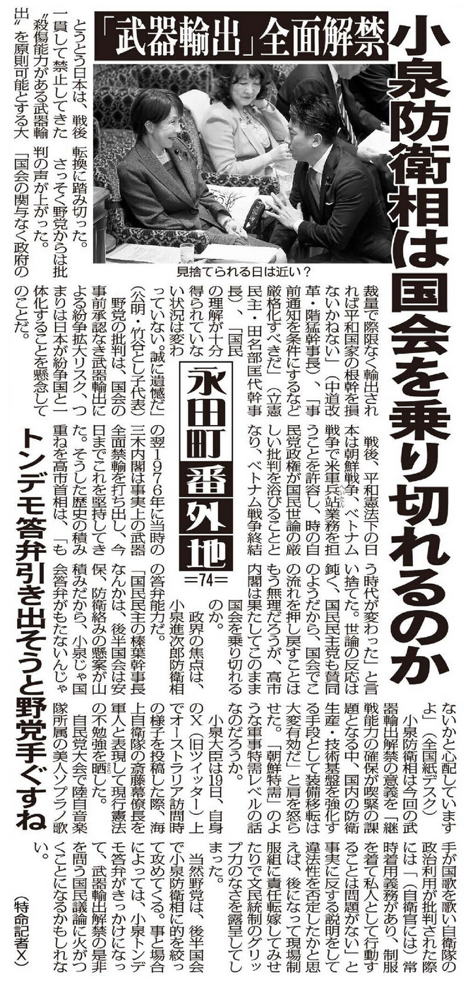 戦後、平和憲法下の日本は朝鮮戦争、ベトナム戦争で米軍兵站業務を担うことを許容し、時の自民党政権が国民世論の厳しい批判を浴びることとなり、ベトナム戦争終結の翌1976年に当時の三木内閣は事実上の武器全面禁輸を打ち出し、今日までこれを堅持してきた。そうした歴史の積み重ねを高市首相は、「もう時代が変わった」と言い捨てた。世論の反応は鈍く、国民民主党も賛同のようだから、国会でこの流れを押し戻すことはもう無理だろうが、高市内閣は果たしてこのまま国会を乗り切れるのか。