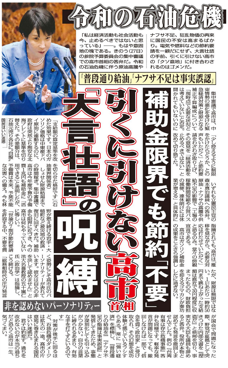 「私は経済活動も社会活動も今、止めるべきではないと思っている」──。もはや意固地の塊である。27日の参院予算委員会の集中審議での高市首相の答弁だ。令和の石油危機に伴う原油高騰やナフサ不足、狂乱物価の再来に国民の不安は高まるばかり。電気や燃料などの節約要請を一顧だにせず、大言壮語の手前、引くに引けない高市首相の「クソ意地」に付き合わされるのはゴメンだ。