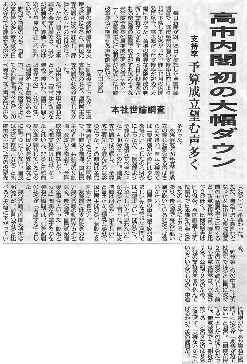 「内閣支持率10ポイント下落 解散評価せず4割 毎日新聞世論調査(24、25日)、前回調査(12月20、21日)の67%から10ポイント下落。国会の冒頭で衆院解散に踏み切った判断については、41%が「評価しない」」