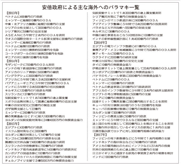 安倍政府は2012年12月の発足後、初外遊先となったベトナムで466億円の円借款を表明したのを皮切りに、精力的なばらまき外交を展開してきた。約4年半でのべ百数十カ国を訪れ、ODA支援や諸諸のインフラ投資を総計すれば100兆円をはるかにこす。最近もインドに総額で5兆円を超す支援を約束し、イギリスが日立から買う原発に2兆円規模の政府補償まで検討し始めた。ばらまき癖はエスカレートする一方だが、いったいどのようなばらまきがやられ、だれが利益を得ているのか。「カネがない」はずの国家財政のどこからばく大な「ばらまき資金」を捻出しているのか。その実態を見てみた【表参照】。
