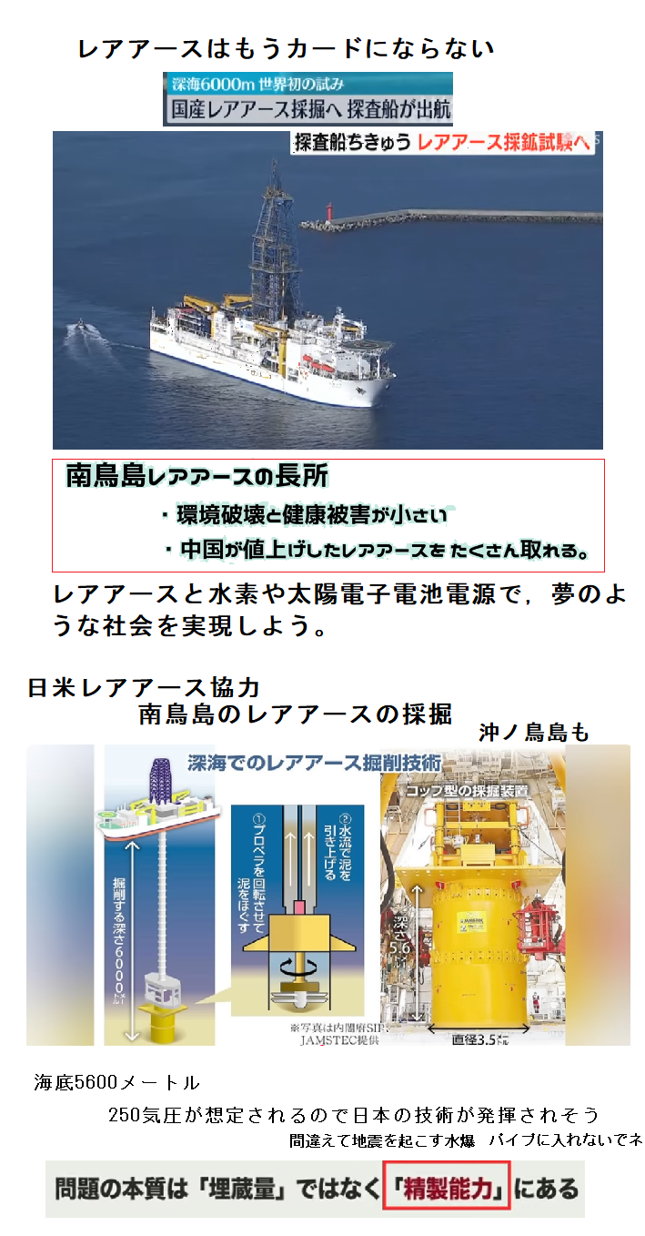 私は両沖ノ島のレアアース量産化や水素と電子電池の時代がくるまで生きられるのを楽しみにしています,若かりし頃,尖閣諸島付近の開発で中国に取られたことが頭をよぎります,石原知事がいたらと思うこと沢山あります。これまで面白い建機を開発したが,当時大切な部分が中国に真似できないことを知ったときの満足度が思い出します。また山火事,移動式雨降り建機や船がいりますね。