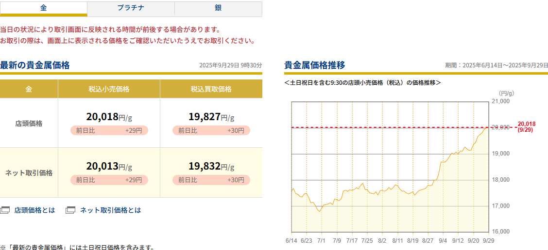 金の国内小売価格の指標とされる田中貴金属工業の店頭小売価格は先週、初めて2万円を突破し、最高値を更新しました。