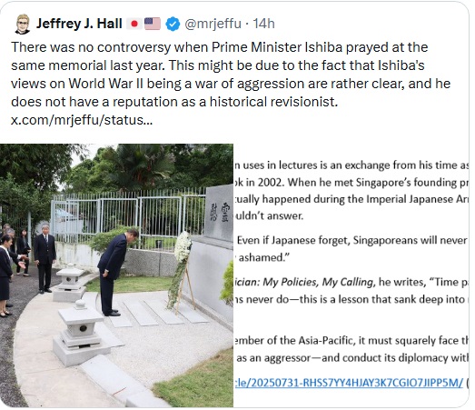 「昨年、石破が同じ記念碑に頭を下げた時はマレーシアの人達は荒れなかった。それは石破が侵略戦争だと認めていたから。」