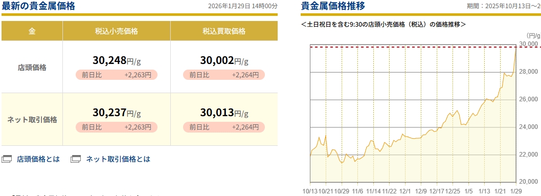 田中貴金属工業の店頭小売価格は29日午後2時時点で、1グラムあたり3万248円となり、初めて3万円を突破しました。