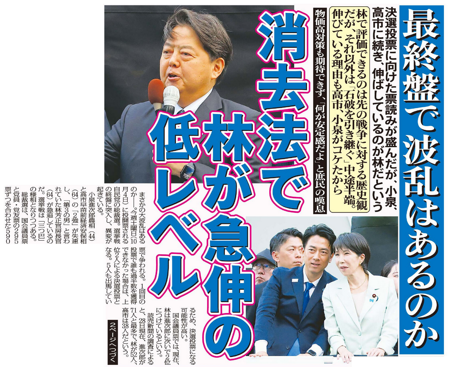 小泉氏リード、高市・林氏追う 自民総裁選、決選投票の公算https://t.co/TVHxkoRSxz