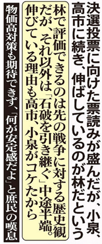 20日、5人の中で最後に正式出馬会見を行った小泉は、昨年の総裁選で打ち出した解雇規制緩和や選択的夫婦別姓制度の早期導入などの“改革イメージ”を封印。「考えが変わったことはありませんが、政治の役割というのは、政策の優先順位を明確にして取り組むことであります」とか言って、控えめな主張に終始した。