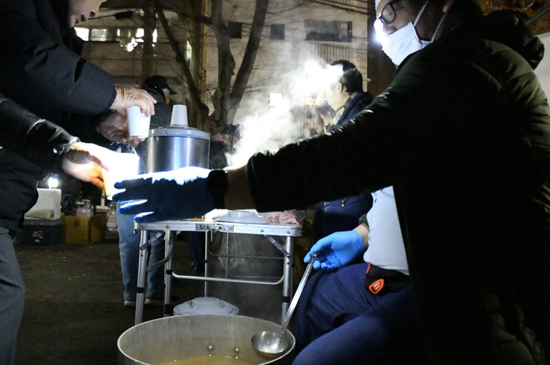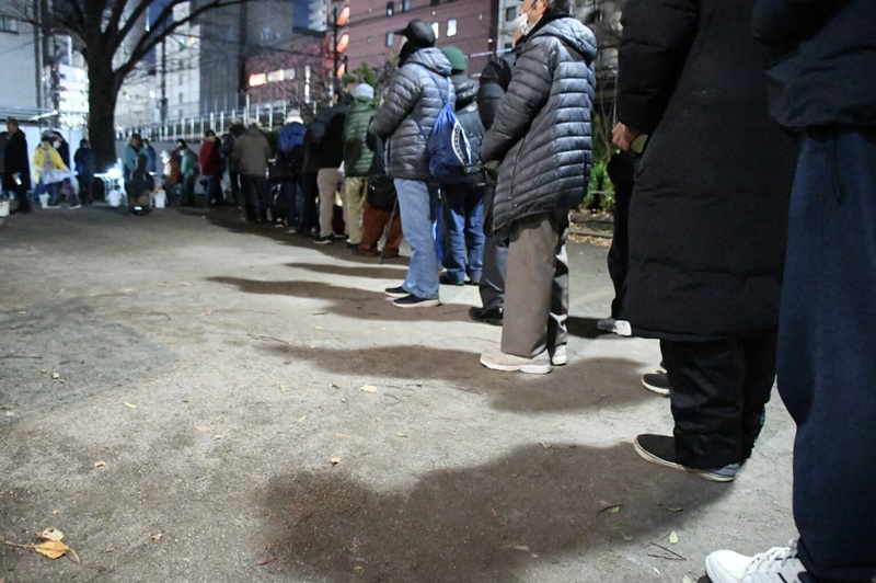 炊き出しの配膳が始まる一時間も前から生活困窮者たちが長蛇の列を作っていた。100人はいるだろう。