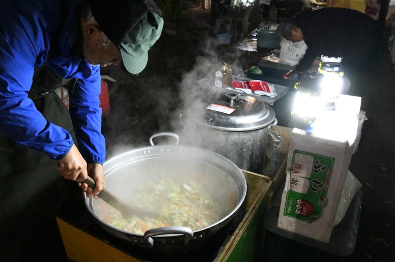 巨大鍋で煮込んでいるのは中華丼だ。=30日夕、渋谷区 撮影:田中龍作=