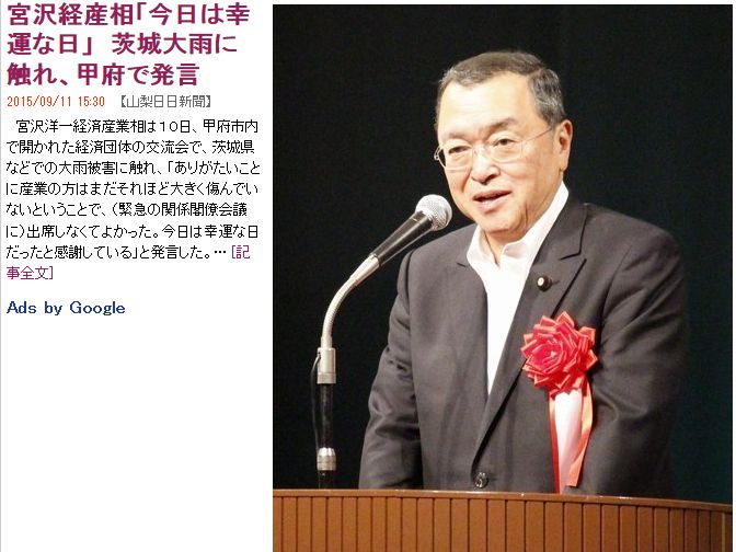 宮沢洋一経済産業相は10日、甲府市内で開かれた経済団体の交流会で、茨城県などでの大雨被害に触れ、「ありがたいことに産業の方はまだそれほど大きく傷んでいないということで、(緊急の関係閣僚会議に)出席しなくてよかった。今日は幸運な日だったと感謝している」と発言した。