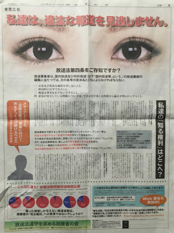肝心の集会は、すでに終盤、リレートーク7人の最後は、沖縄辺野古で基地反対活動を撮り続けている映画監督の影山あさ子さんだった。前にもシンポジウムのパネリストとしての発言を聞いたことがある。沖縄の基地反対運動の実態を克明に撮影して来て見えること、ほとんどのメディアがその実態を伝えていないこと、とくにNHKは豊かな人材と機器を持ちながら、遠く離れた地点から、あるいは上空から取材するだけだという。しかも、ふだんの取材はなく、何か「ヤバイ」ことが起こりそうな時だけ、どういうわけか取材に現れるという不思議も語っていた。また、東京から派遣された機動隊員は、朝の30分で、座り込みの人たちを排除して、一泊1万円もするホテルに引き上げるという。ほかにする仕事はないらしい。「本工事に着工」と本土のメディアは報じるけれど、なにも始まってはいない。既成事実をつくるのに手を貸しているメディアが少なくない中で、零細の映画製作者の影山さんたちは、潜水をいとわない取材、そのためにはカヌーが欲しいという。皆さん一度辺野古に来てください、と締めくくった。メモを見るでもなく、堂々とした話しぶりだった。