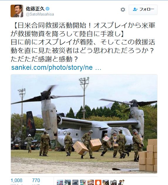 緊急事態条項といい、オスプレイといい、政府は今回の地震をいかに政策アピールに利用するかということばかり考えているように見える。